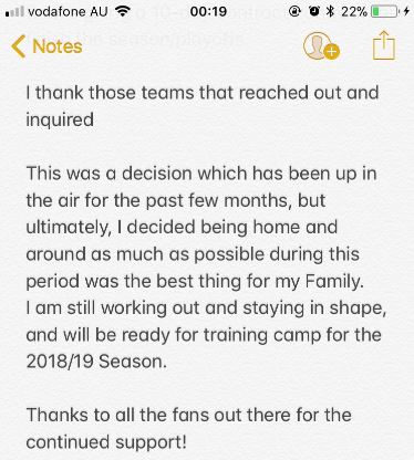 He released a statement today informing all of the recent death of his grandfather Mile and of his wife’s high-risk second pregnancy, which has brought him and his young family home to Melbourne … for the time being.