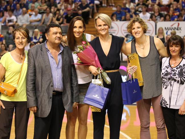 LIGHTNING LEGENDS: From left, FIBA Hall of Famer, four-time Lightning championship and 2006 Opals World Champion coach Jan Stirling, Vince Marino, triple Olympian Laura Hodges, retiring WNBL superstars Jenni Screen and Jess Foley, with Vince's wife Caterina earlier this year.