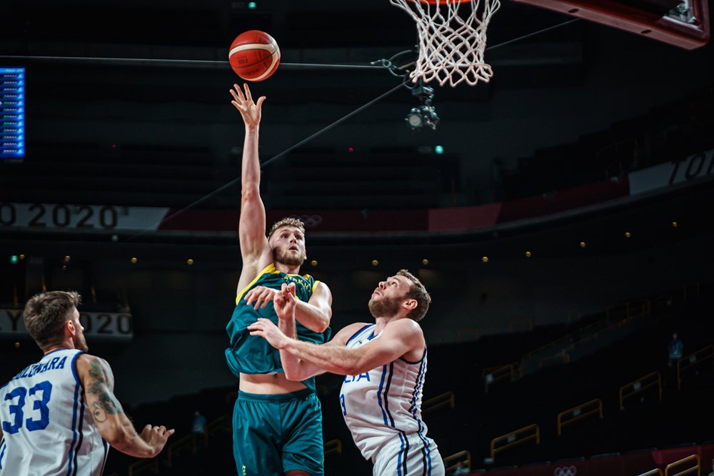 And tonight it largely had its array of "bigs" to thank for escaping Italy's clutches, Jock Landale (below) leading the way with 18 points at 64 per cent, Nick Kay with 15 at 86 per cent, and Aron Baynes 14 at 56 per cent. All three hauled down seven rebounds apiece, Australia crashing the boards to the tune of 44-30.