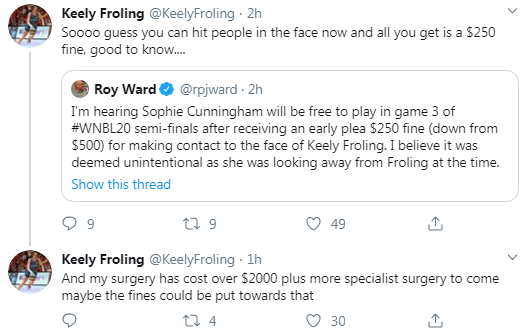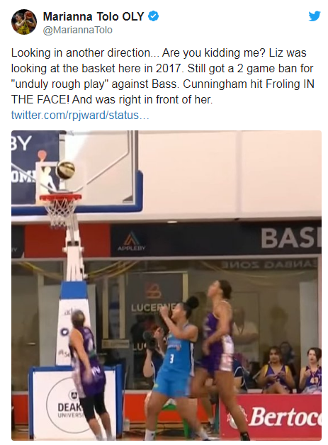 Cunningham copped a $500 fine earlier this season after taking an early plea following an incident where she flattened Caps guard Maddison Rocci seconds after smashing Froling to the floor in Canberra.