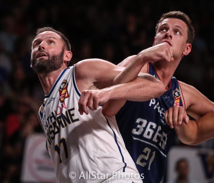 GREATS: Anthony Petrie locks up with Daniel Johnson in his farewell NBL game.