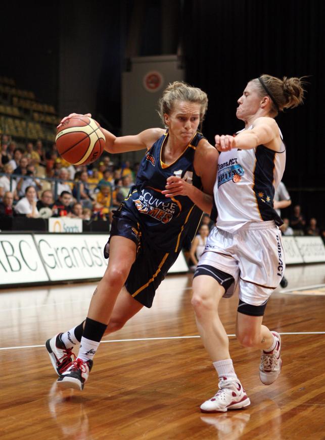NEW SIGNING: Mikaela Dombkins as a Flame, drives against the Caps.