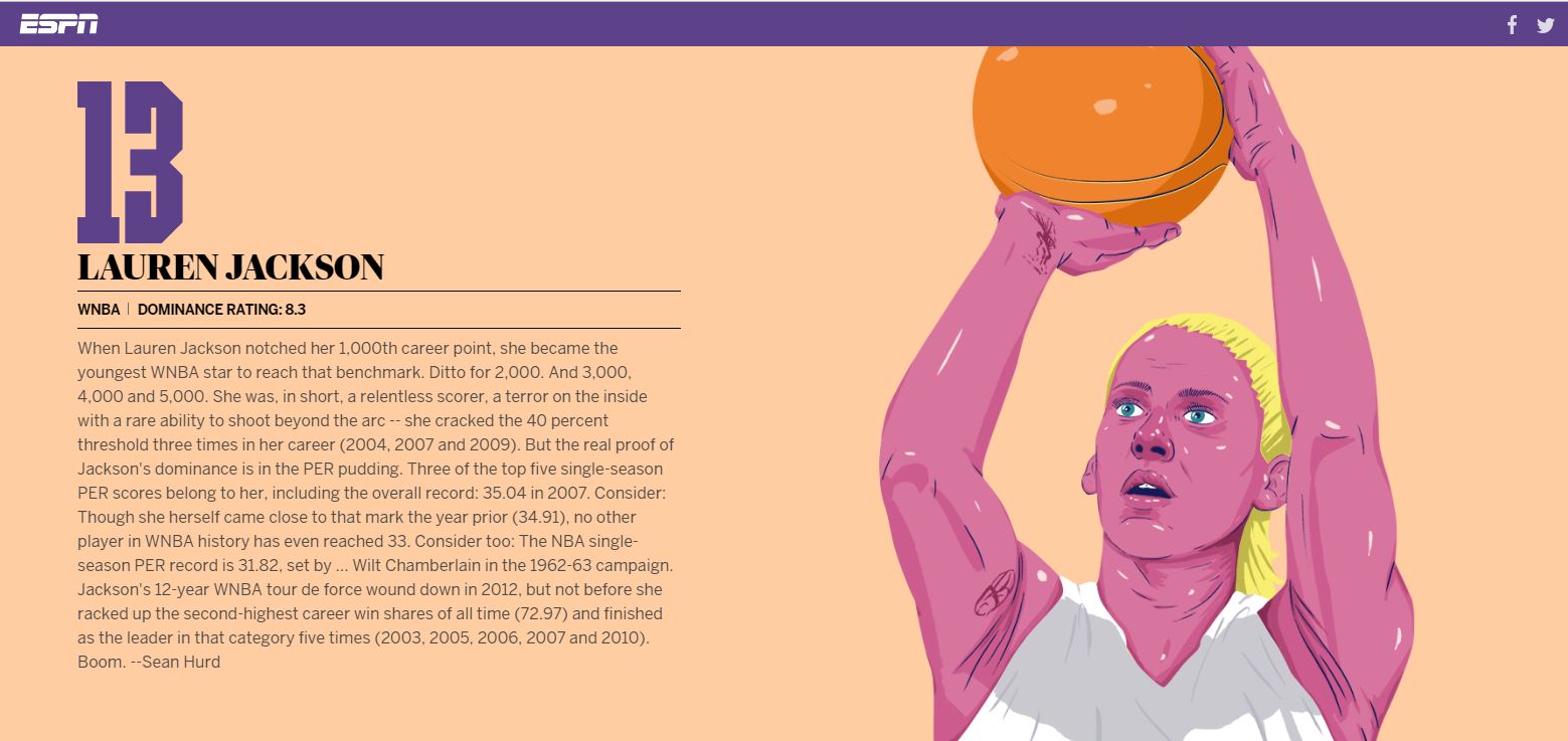 When Lauren Jackson notched her 1,000th career point, she became the youngest WNBA star to reach that benchmark. Ditto for 2,000. And 3,000, 4,000 and 5,000. She was, in short, a relentless scorer, a terror on the inside with a rare ability to shoot beyond the arc - she cracked the 40 percent threshold three times in her career (2004, 2007 and 2009). But the real proof of Jackson's dominance is in the PER pudding. Three of the top five single-season PER scores belong to her, including the overall record: 35.04 in 2007. Consider: Though she herself came close to that mark the year prior (34.91), no other player in WNBA history has even reached 33. Consider too: The NBA single-season PER record is 31.82 set by ... Wilt Chamberlain in the 1962-63 campaign. Jackson's 12-year WNBA tour de force wound down in 2012, but not before she racked up the second-highest career win shares of all time (72.97) and finished as the leader in that category five times (2003, 2005, 2006, 2007 and 2010). Boom.