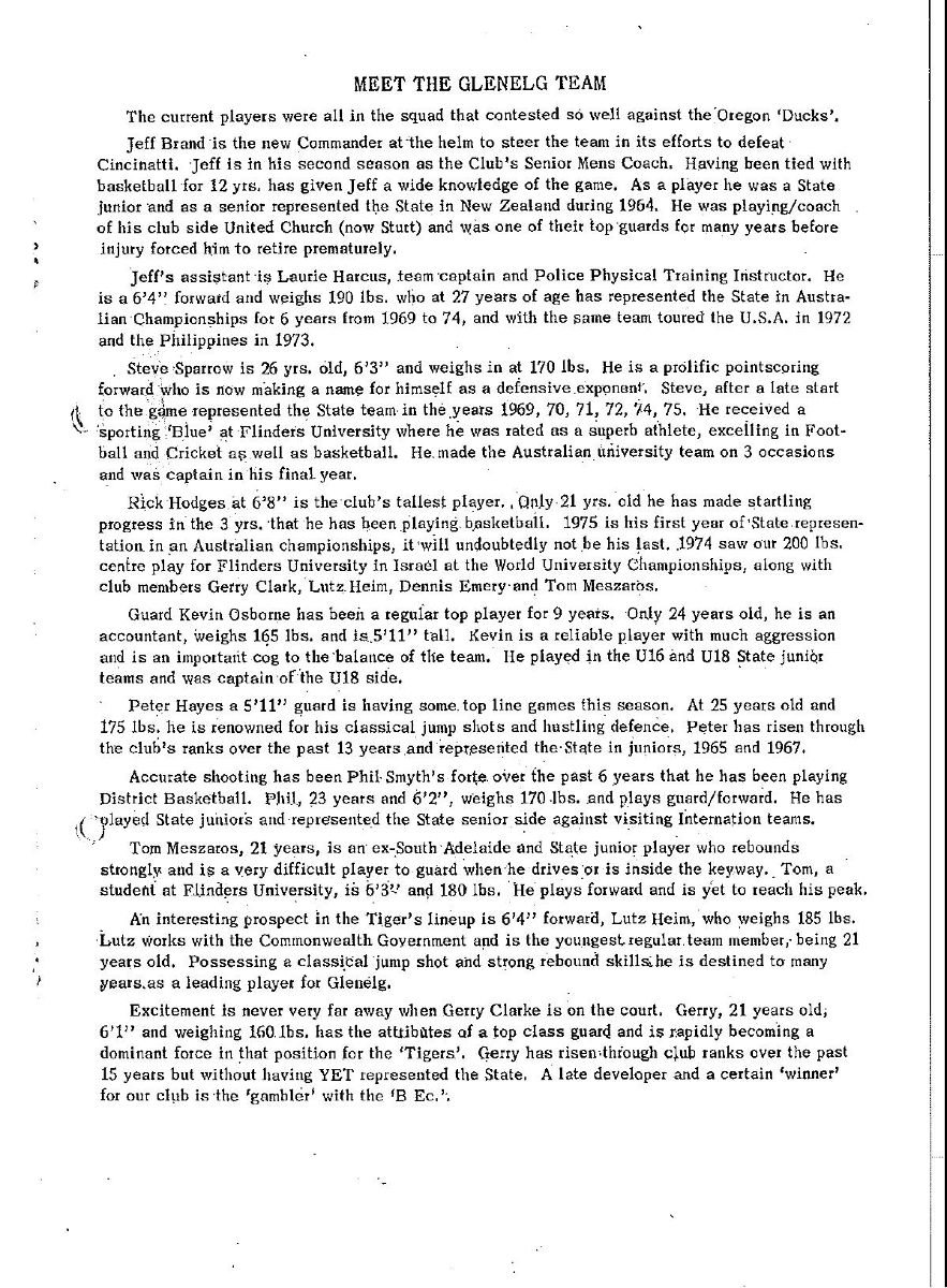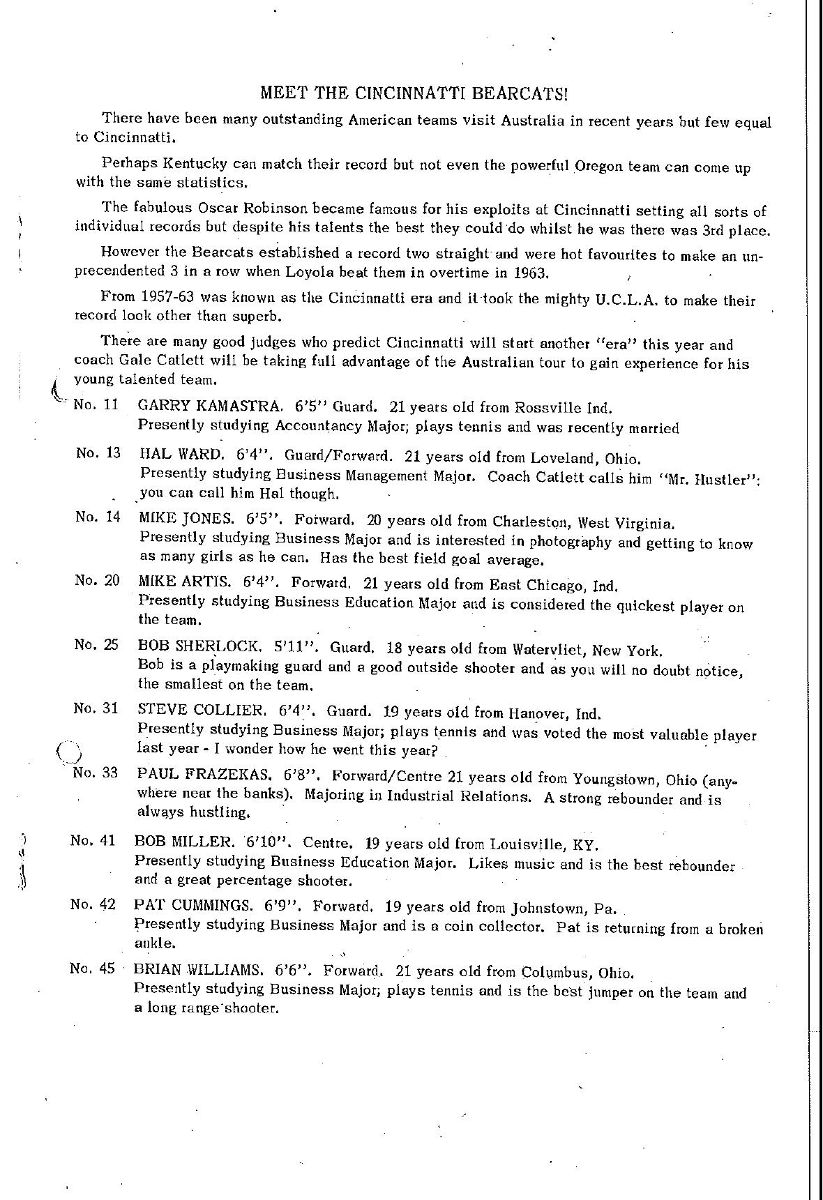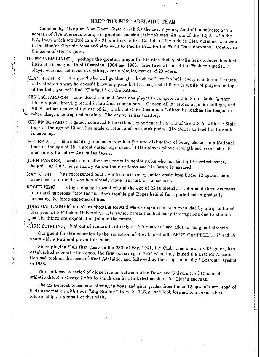 IN 1975, the Cincinnati Bearcats toured Australia, stopping off in South Australia for two games against the state's inaugural pair of NBL teams, West Adelaide and Glenelg Tigers. The match against West was especially interesting for the home team, which had taken its nickname from Cincinnati's Bearcats. This was the match-day program.