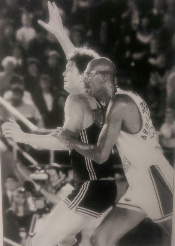 HANDS UP IF YOU'RE NBA-BOUND: Luc Longley posts up Kareem Abdul Jabbar.
