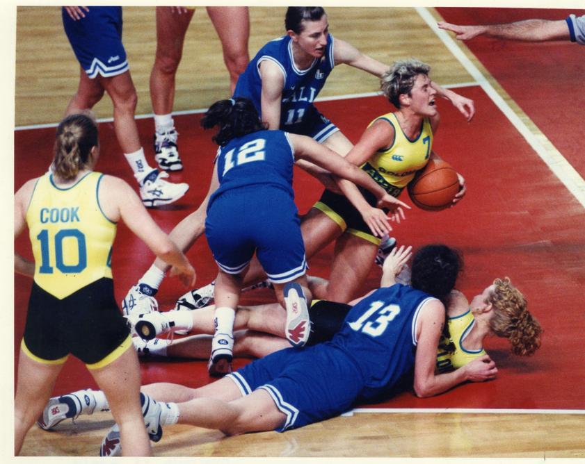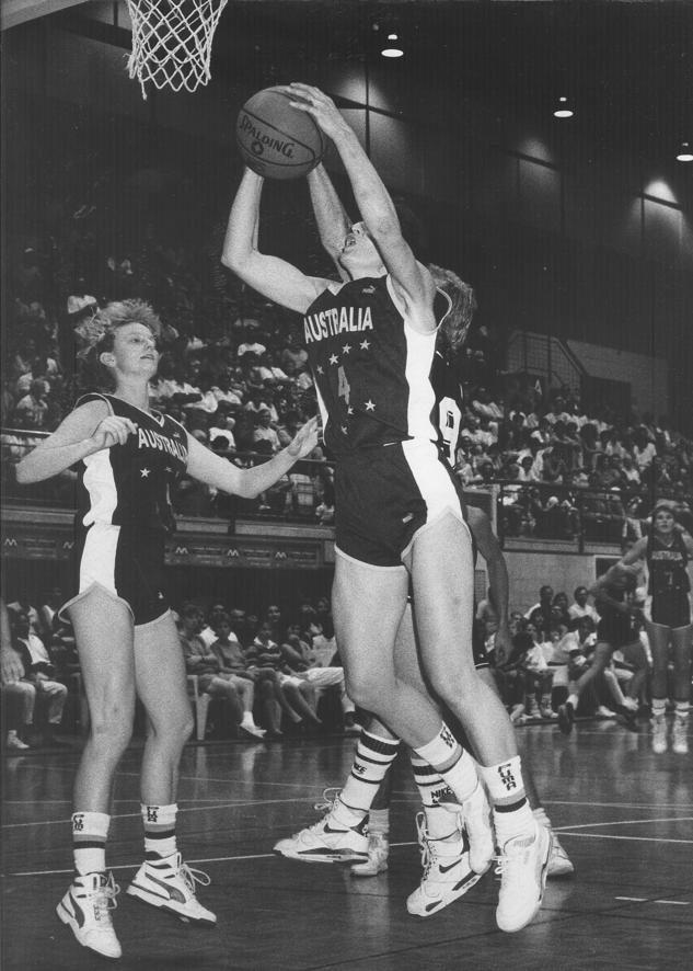 OPALS DIAMONDS: Tracey Browning, left, watches as Robyn Maher grabs a rebound for Australia.