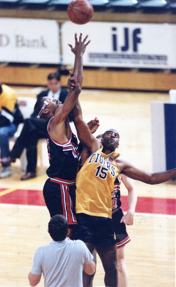 WHERE IS HE? Leroy Loggins sneaks around Steve Carfino.