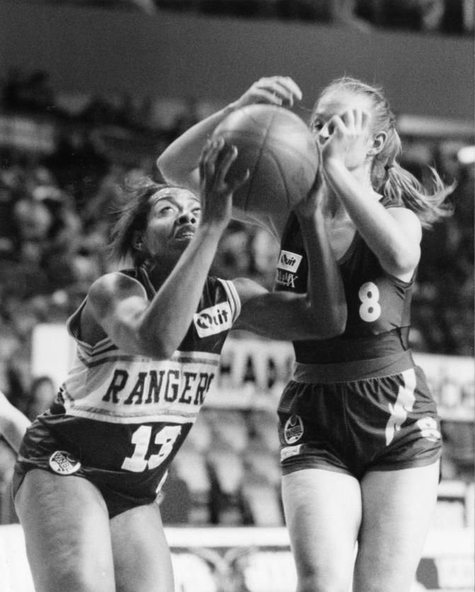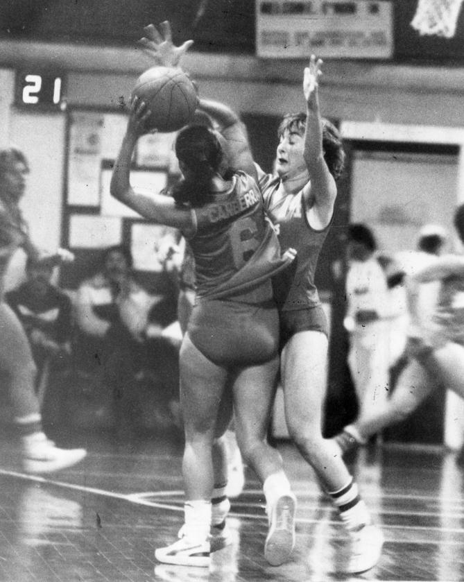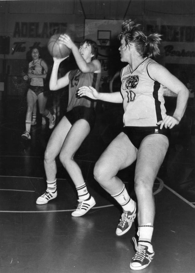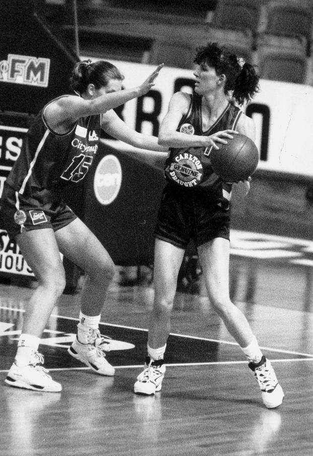 EARLY WNBL: West's Sue Collins pulls up against Noarlunga superstar Julie Nykiel.
