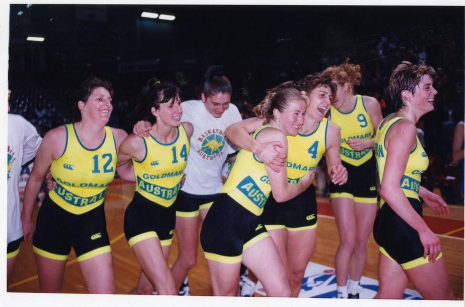 FLAME ON: Rhonda Corkeron lifts a jubilant Annie LaFleur as Sydney wins the 1997 WNBL title.