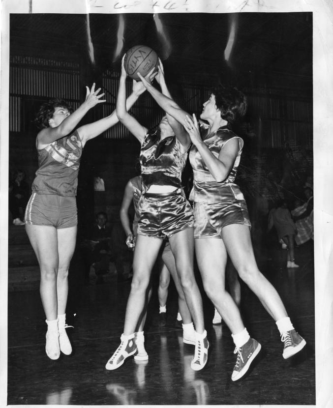 OLD DAYS: Vytis' Dalia Radzevicius battles Falcons' Margaret Whitehorn and Jan Sinkinson.