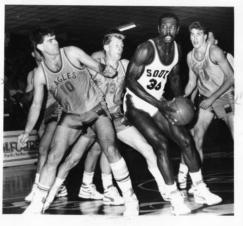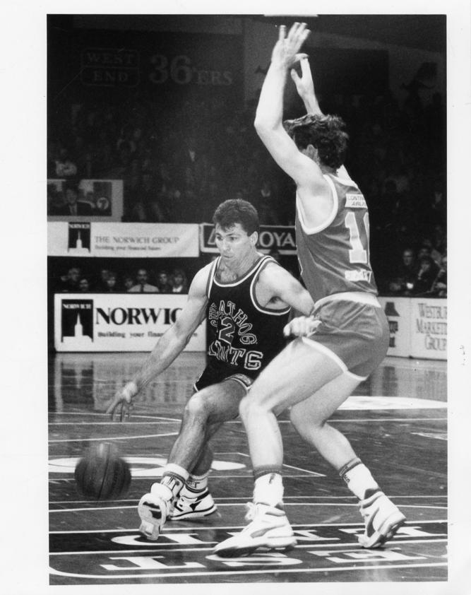 DONNIE & JOHNNY: Donnie Gipson slips past John Wesley in a SEABL clash.