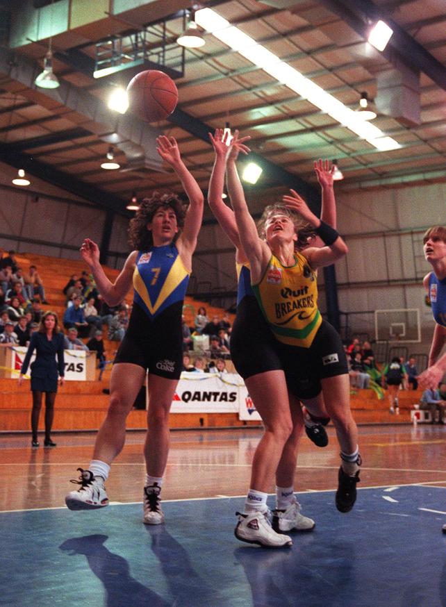 WNBL OLDEN DAYS: Tully Bevilaqua slips past Debbie Slimmon.