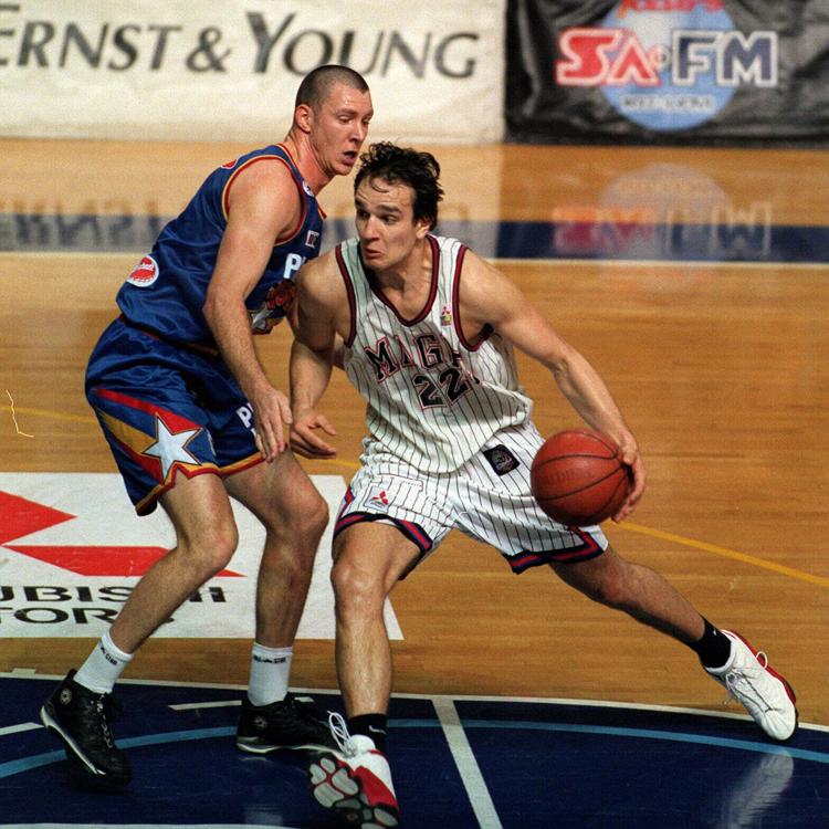 BIRD'S EYE VIEW: Mel Thomas battling Pat Reidy in the 2001 NBL Grand Final.