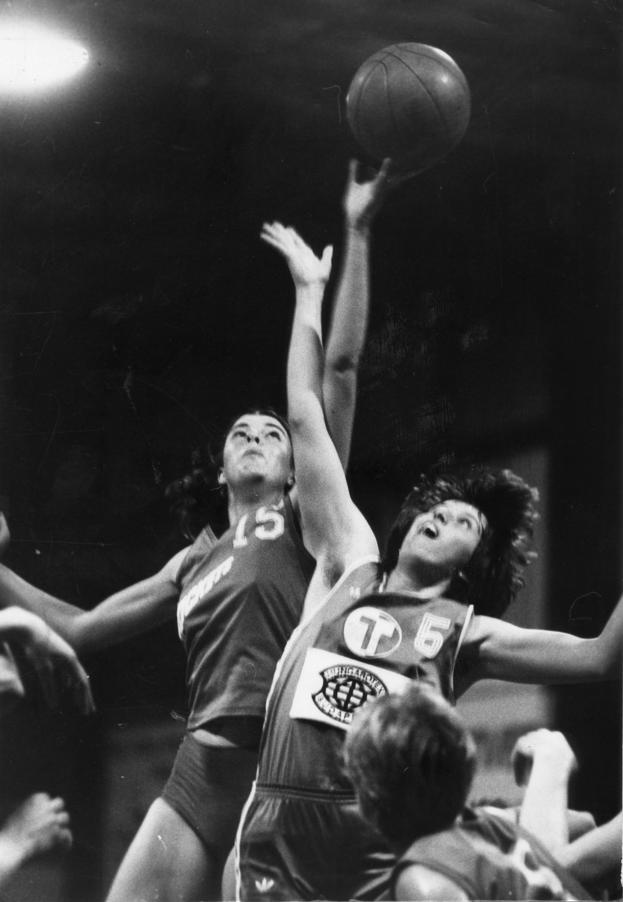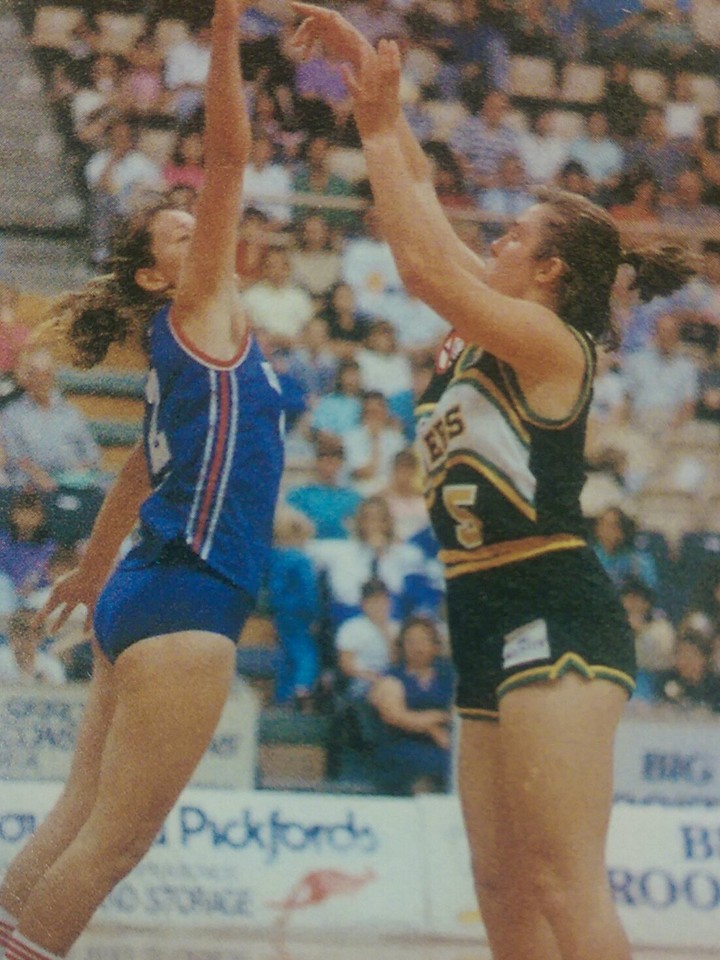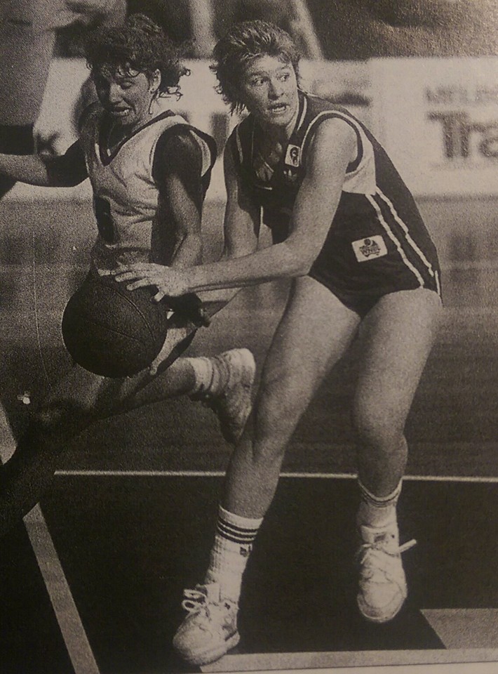 WNBL 1989 GF: Hobart's Debbie Black misses the steal from Nunawading's Sam Thornton.
