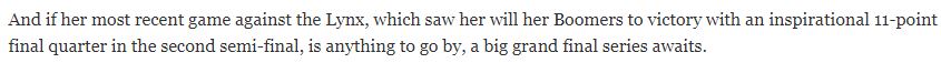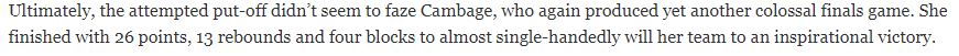 The fact is though Townsville has really upped the defensive ante since the finals began. The Fire held defending champion Sydney to 57ppg at 29 percent during their semi final sweep and Melbourne to 64 points at 35 percent in winning Game 1.