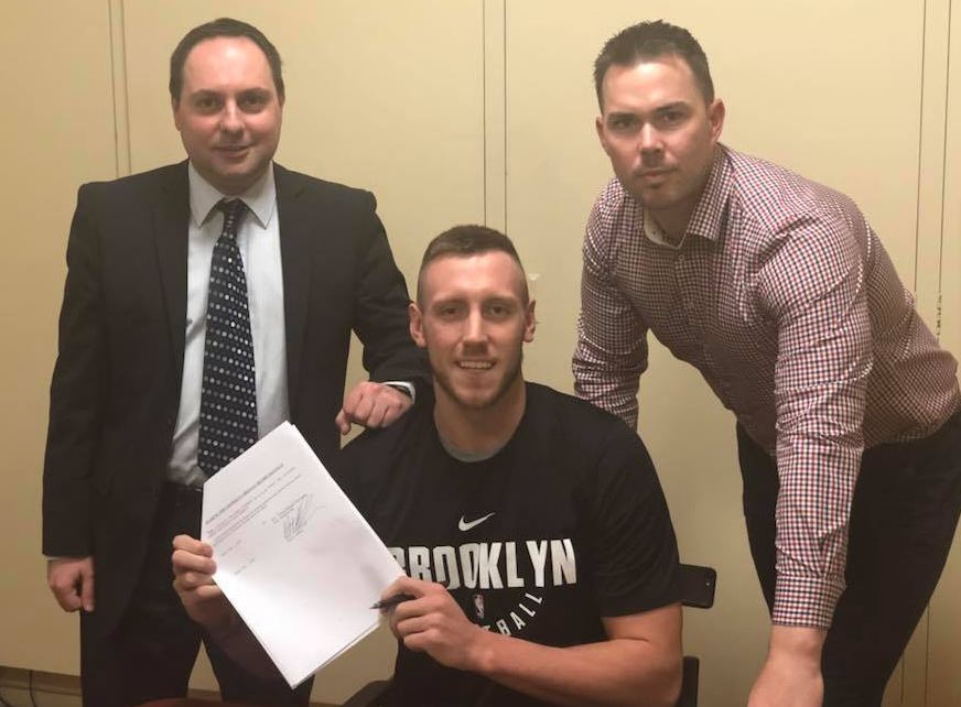NEW YORK BOUND: Mitch Creek with his Brooklyn Nets contract and Mogul Sports' Stephen Kellis and Jye Watson.