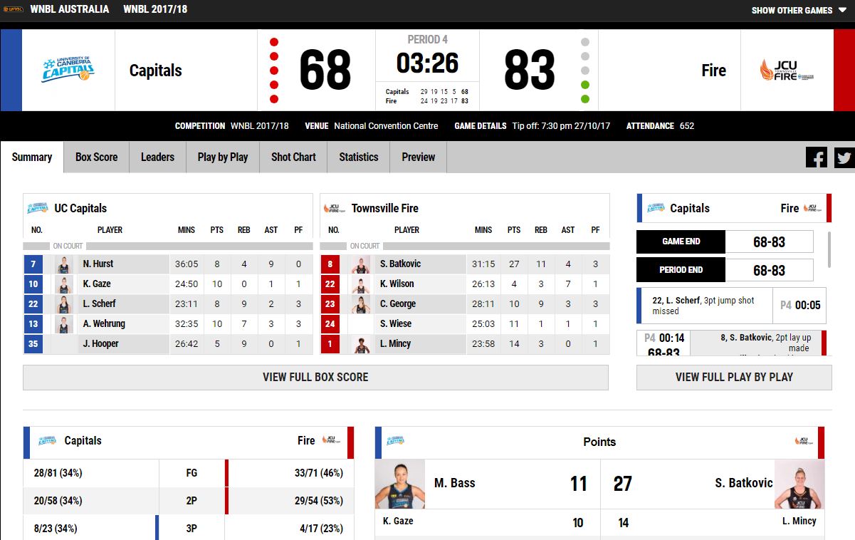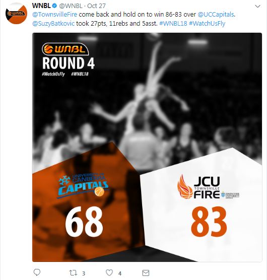 TOWNSVILLE FIRE 83 (Batkovic 27; Mincy 14, Wiese 11, George 10; Batkovic 11 rebs;Wilson 7 assts) d UNI of CANBERRA CAPITALS 68 (Bass 11, Froling, Gaze, Wehrung 10; Scherf, Hooper 9 rebs; Hurst 9 assts) at The Alphabet Soup, National Convention Centre.