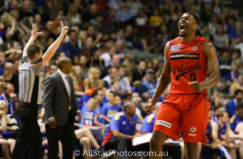 ECSTATIC: Jermaine Beal celebrates his game-breaking three against Adelaide. This is how NBL fans should feel after Week 1, not finding new reasons to bitch and moan. Maybe go follow bocce?