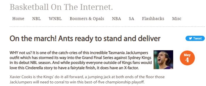 GAME 1: SYDNEY KINGS 95 (Adams 18, Clark 17, Cooks, Vasiljevic 14; Cooks 11 rebs; Cooks 7 assts) d TASMANIA JACKJUMPERS 78 (McIntosh, McVeigh 14, Steindl, Adams 13, Magette 10; Adams 8 rebs; Magette 10 assts) at The Kingdome, Qudos Bank Arena. Crowd: 12,765