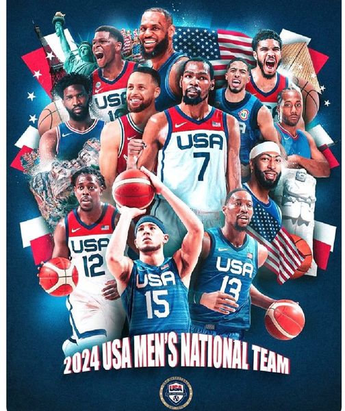 USA 2024 is LeBron James (Los Angeles Lakers), Kevin Durant (Phoenix Suns), Bam Adebayo (Miami Heat), Devin Booker (Phoenix Suns), Stephen Curry (Golden State Warriors), Anthony Davis (Los Angeles Lakers), Anthony Edwards (Minnesota Timberwolves), Joel Embiid (Philadelphia 76ers), Tyrese Haliburton (Indiana Pacers), Jrue Holiday (Boston Celtics), Kawhi Leonard (L.A. Clippers) and Jayson Tatum (Boston Celtics).