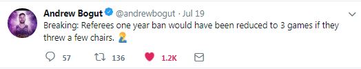 The guy caught clearly from several angles throwing the chair which struck Sobey in the back of the head? Zero penalty. Move along. Nothing to see here, apparently.