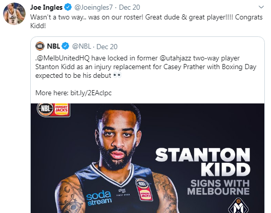 Meanwhile Kidd, who is expected to make his NBL debut on Boxing Day in the open-roof clash with Cairns, had this Twitter endorsement from Joe Ingles for his former NBA teammate: