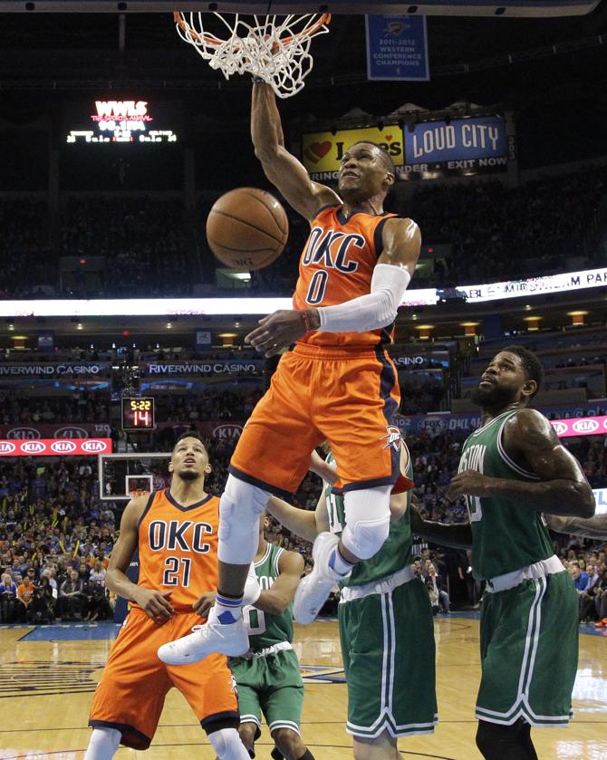 RAMPANT RUSSELL: Westbrook with the spectacular points against boston. PIC: Sue Ogrocki