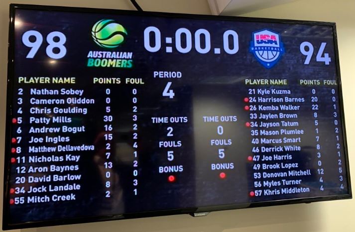 Game 2: AUSTRALIA BOOMERS 98 (Mills 30, Bogut 16, Ingles 15, Baynes 13; Bogut 9 rebs; Ingles 7 assts) d USA 94 (Walker 22, Barnes 20, Mitchell 12; Barnes 6 rebs; Smart 3 assts) at Marvel Stadium, Melbourne.