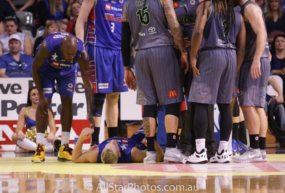 CONKED: Ebi Ere goes to Mitch Creek's aid after his clash with Brian Conklin.