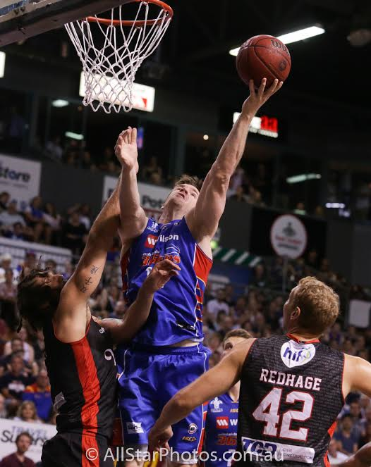 NBL Action: Lucas Walker (36ers) splits Perth defenders Matt Knight and Shawn Redhage.