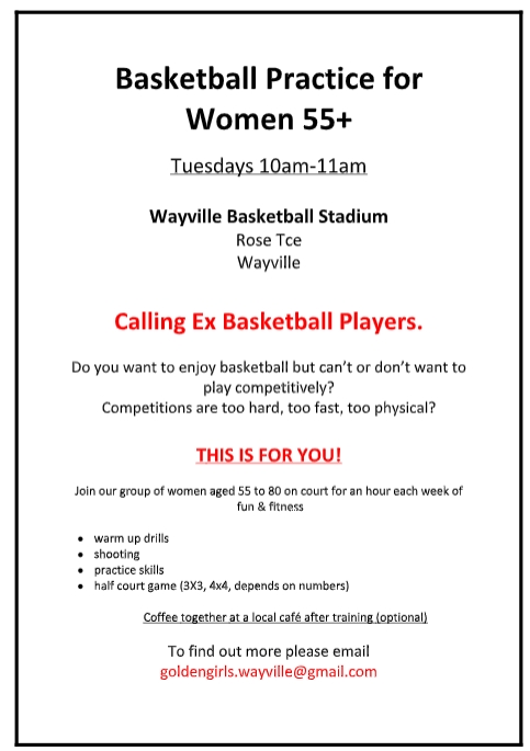 TweetFEELING like you could use a little jog up and down the basketball court like the good old days? Then Ladies, if you live in Adelaide, this is for you. Every Tuesday from 10-11am at centrally-located Wayville Sports Centre, you can relive the glory days ... provided you are between 55 and 80 and keen to have a little movement back in your life.