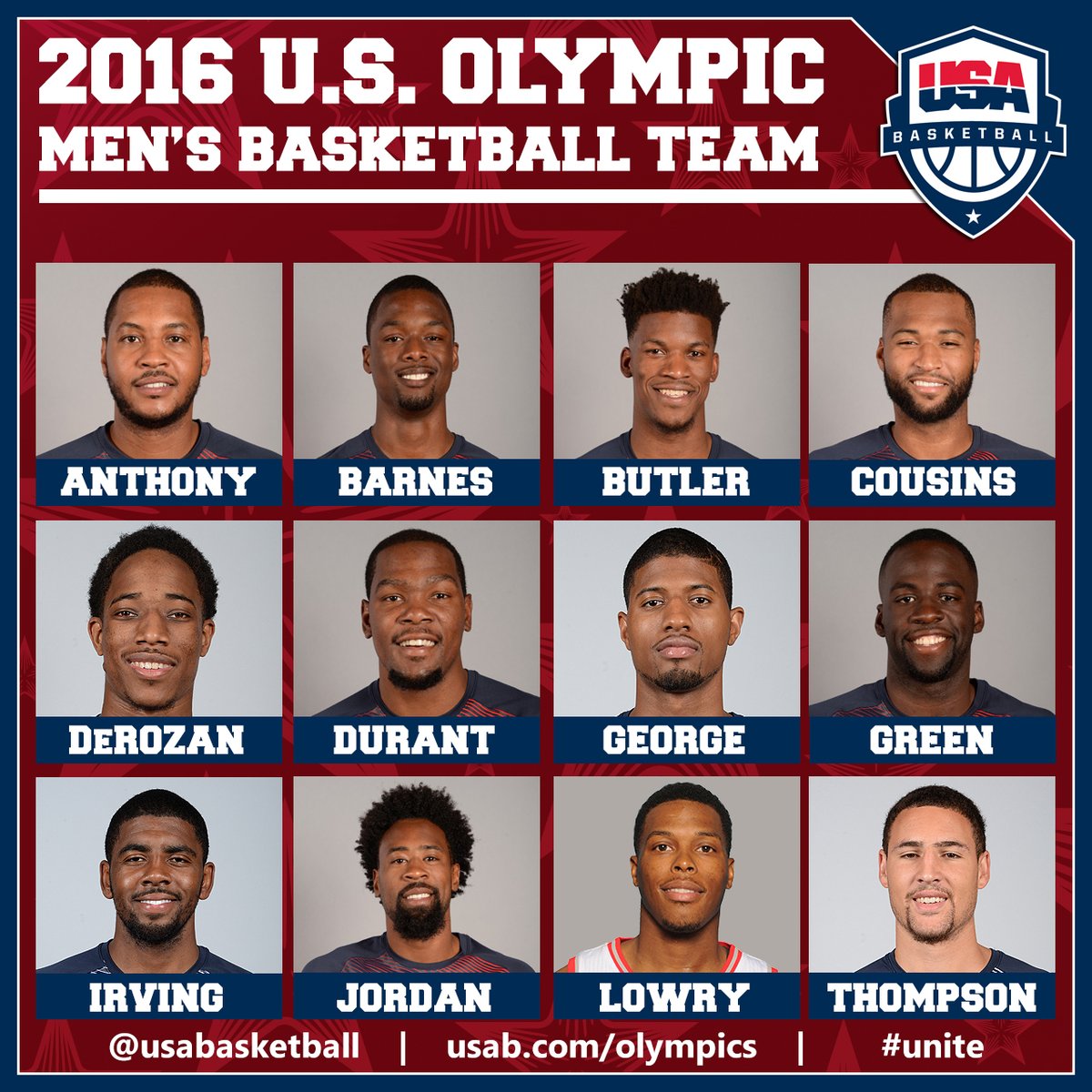 So here they are: Kyrie Irving (Cleveland), Klay Thompson (Golden State), Carmelo Anthony (NY Knicks), Durant (Oklahoma) , DeMarcus Cousins (Sacramento), Kyle Lowry (Toronto), DeMar DeRozan (Toronto), Harrison Barnes (Golden State), Draymond Green (Golden State), DeAndre Jordan (LA Clippers), Paul George (Indiana), Jimmy Butler (Chicago).