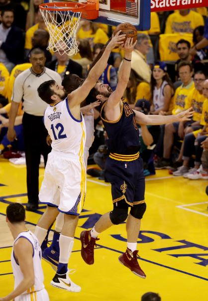 NO LOVE: Andrew Bogut blocks Kevin Love. Picture: NBA.COM STATS