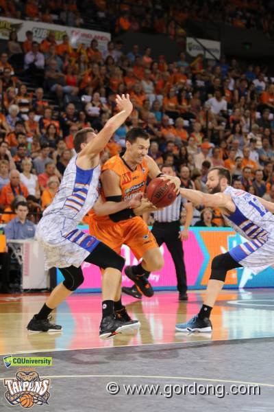 DOUBLE-TEAM: Cairns Alex Loughton breaks a 36ers double-team in Friday's win.