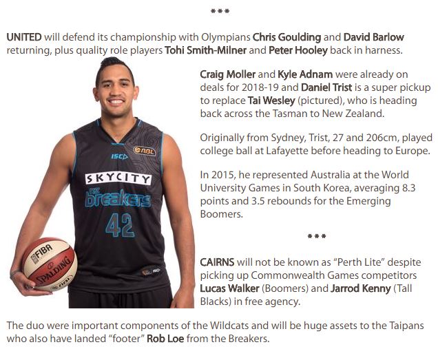 United championship power forward Tai Wesley and his back-up Majok Majok both already are Breakers, the club clearly heading in a different direction under new coach Kevin Braswell, with Rob Loe also gone and now with Mike Kelly’s Cairns Taipans refit. But you knew that ...